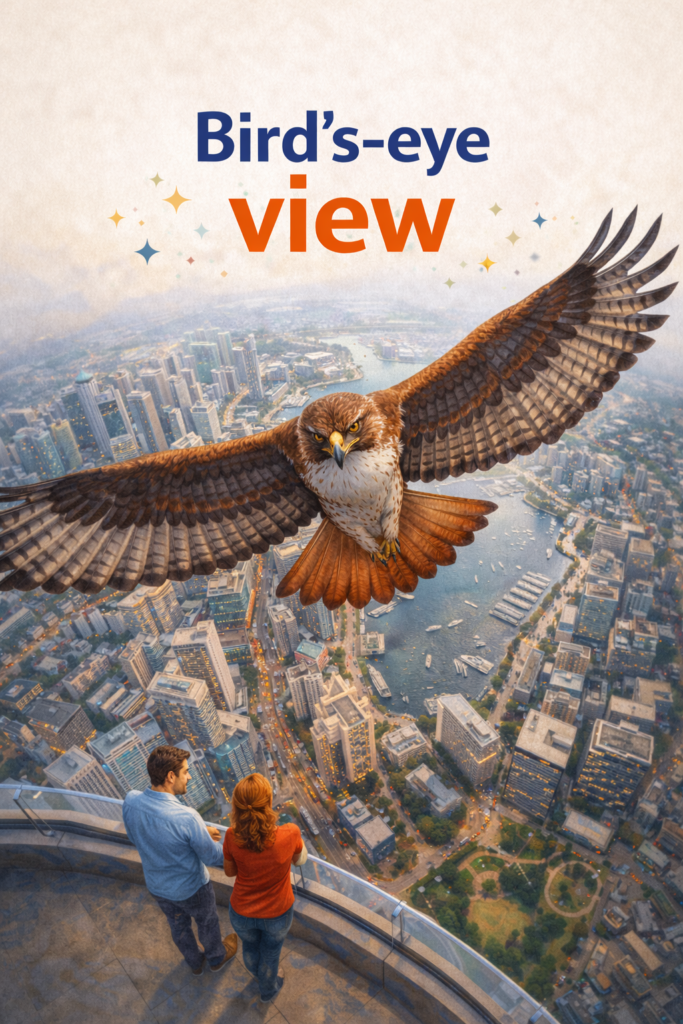 Bem, você já se perguntou como seria ver o mundo do ponto de vista de um pássaro? Esse é o conceito da expressão idiomática que vamos explorar hoje. A expressão “bird’s eye view” geralmente é usada em inglês para descrever uma perspectiva abrangente ou panorâmica de algo. Quando dizemos “bird’s eye view” em inglês, estamos